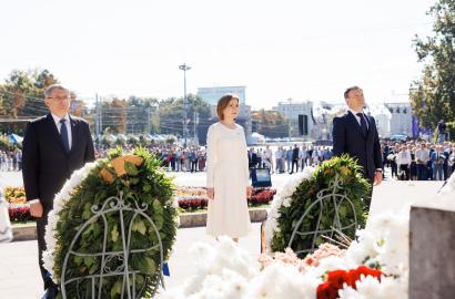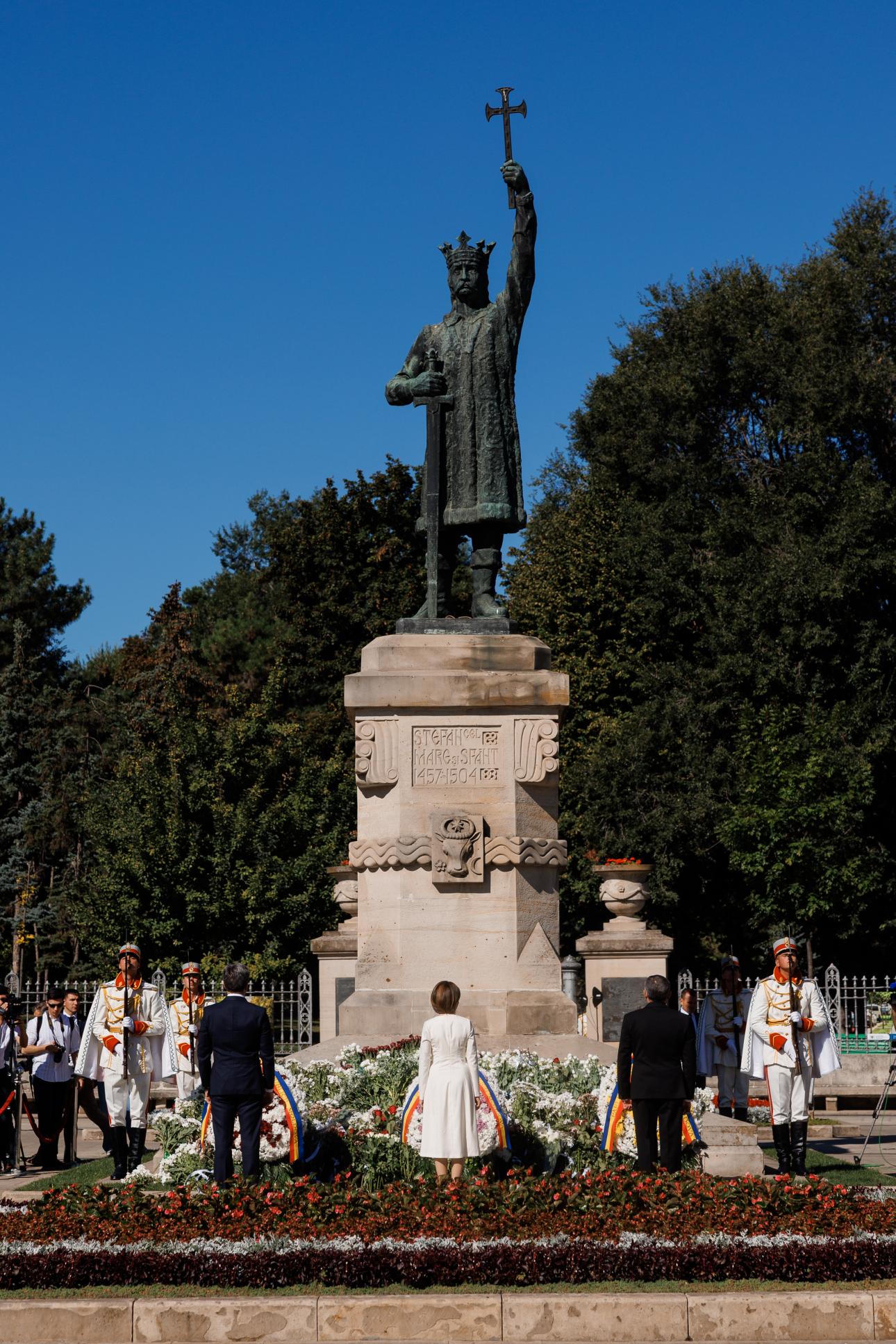 Prime Minister Dorin Recean, together with President Maia Sandu and the Speaker of Parliament, Igor Grosu, laid flowers at the Grieving Mother monument at the Eternity Memorial Complex and at the monument to Ruler Stephen the Great and Holy, on the Independence Day of the Republic of Moldova.