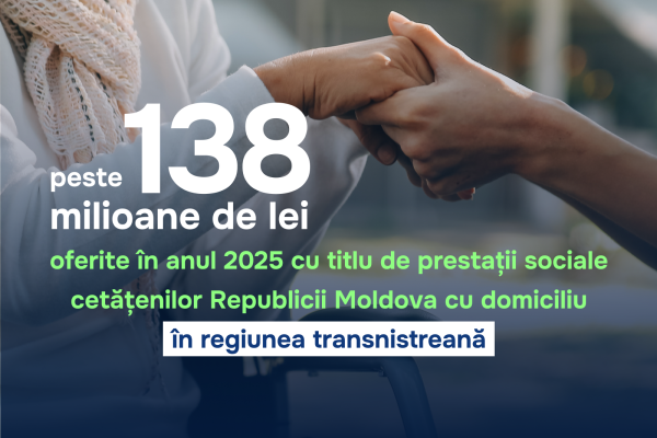 Read More Peste 138 milioane de lei oferite în anul 2025 cu titlu de prest... În anul 2025, cetățenii Republicii Moldova domiciliați în regiunea transnistreană au beneficiat de prestații sociale în valoare sumară...