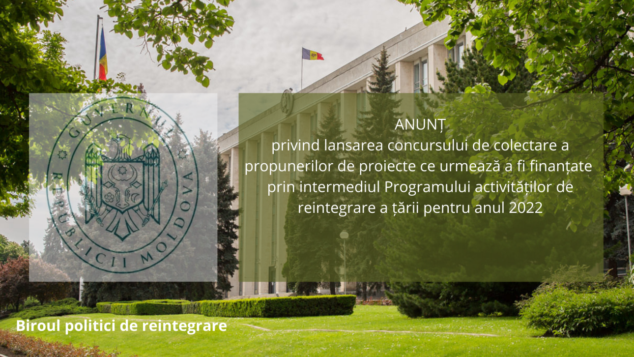 Astfel, în conformitate cu prevederile Hotărârii Guvernului nr. 131 din 21.02.2014, anunțăm că în perioada 01 februarie – 04 martie 2022, va avea loc concursul de colectare a propunerilor de proiecte ce urmează a fi evaluate, selectate și aprobate pentru finanțare prin Programul activităților de reintegrare a țării pentru anul 2022.