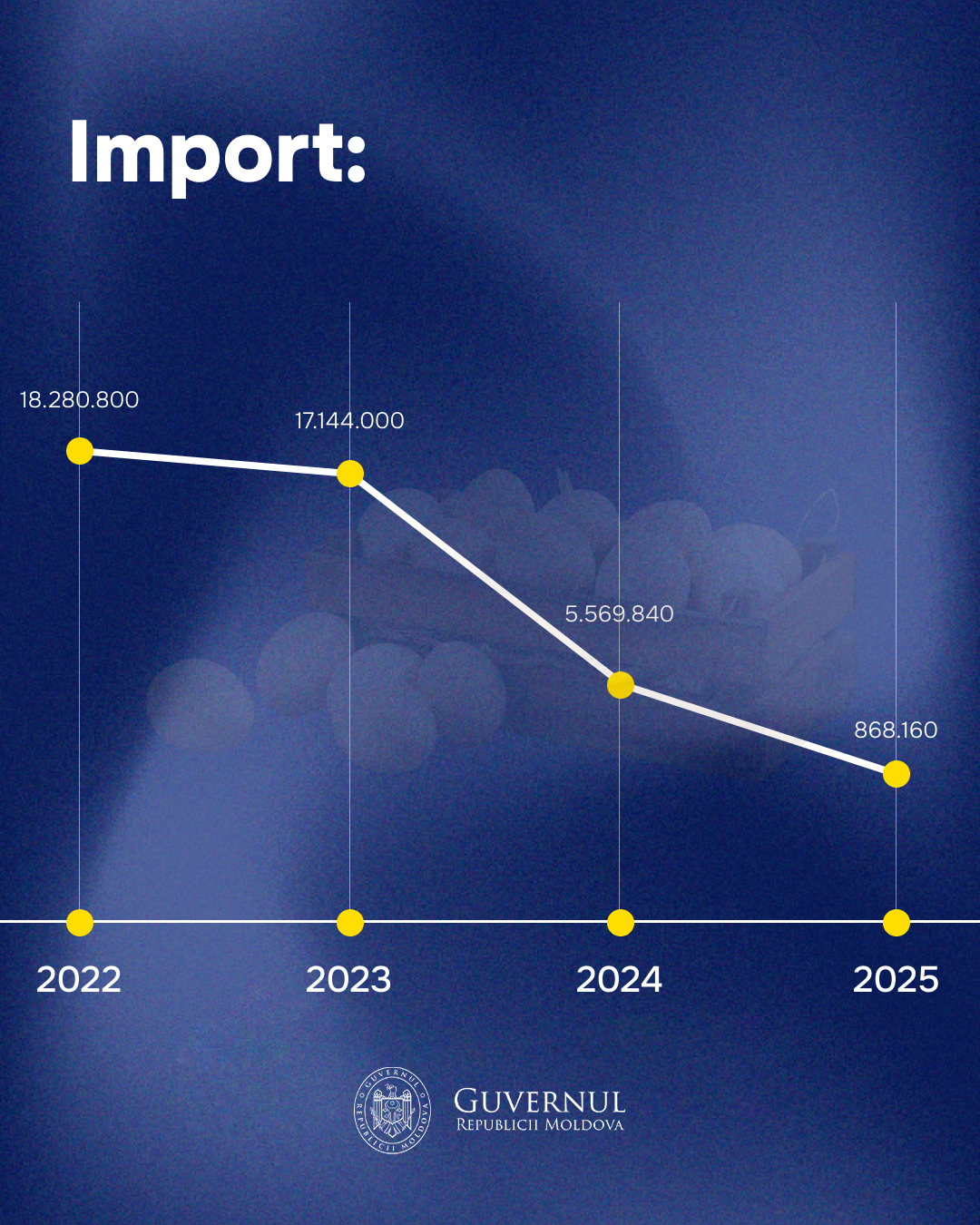 On the other hand, the production of eggs to supply demand on the domestic market also increased, leading to a significant reduction in imports of eggs. The volume of imported eggs has dropped by more than 20 times over the past four years. While in 2022, Moldova imported 18,280,800 eggs, this year, only 868,160 pieces were brought in.
