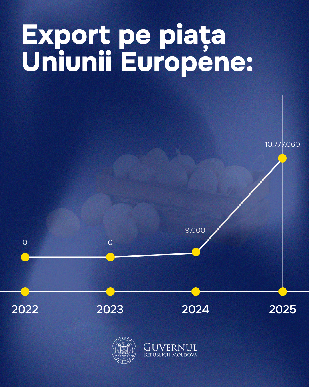 The export of chicken eggs for consumption to the European Union market has reached almost 11 million pieces in the first half of 2025. This is a significant increase, following Moldova's acquisition, in 2023, of the right to export eggs to the EU market.