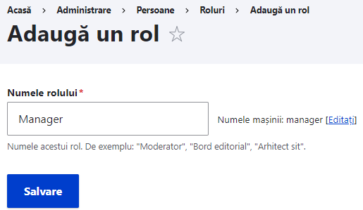 - Accesare secțiunea Roluri În meniul Gestionare administrativ, navigați la Persoane > Roluri (ruta: /admin/people/roles).